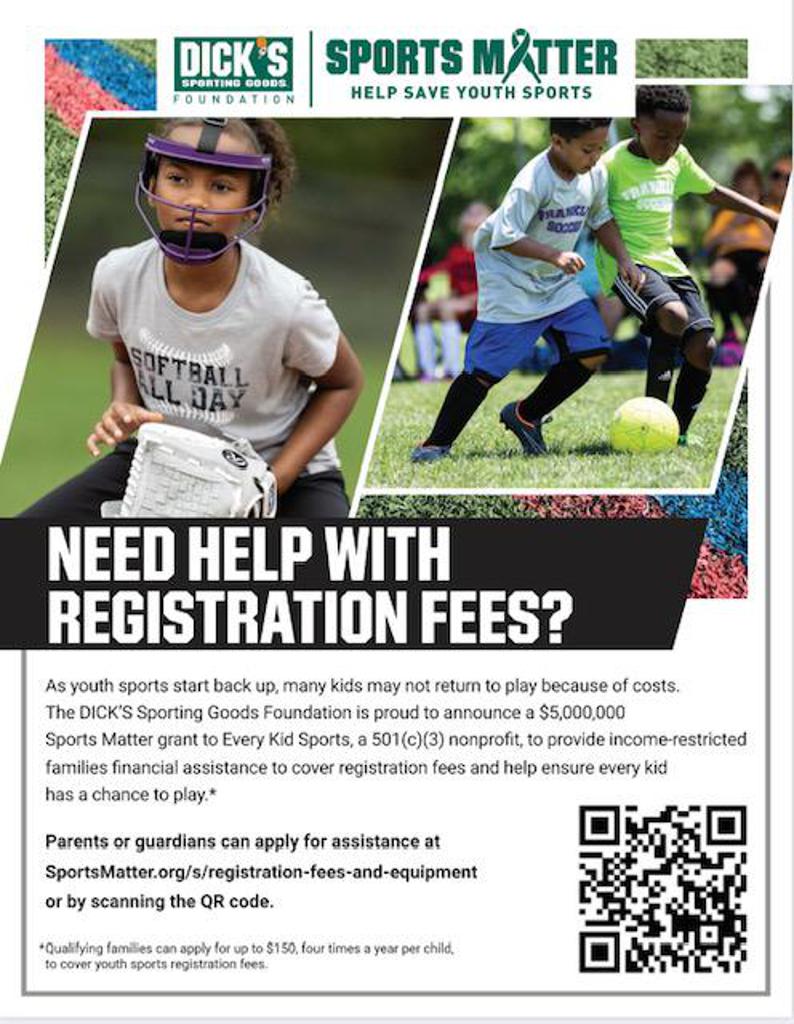 Our partner DICK'S Sporting Goods is once again back helping kids play the game they love! Visit the Every Kids Sports Pass link to apply for FREE Registration through the Sports Matter Grant!